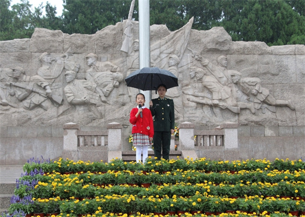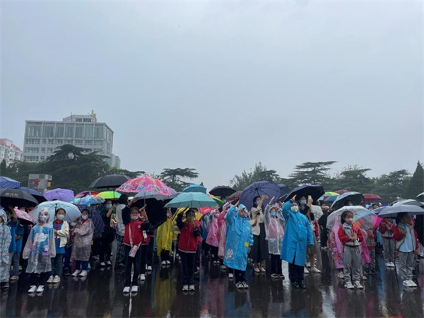 上午九時,活動正式開始。由講解員組成的國旗護衛隊英姿颯爽,在莊嚴的國歌聲中。邁著鏗鏘的步伐走向國旗臺,現場群眾列隊目送五星紅旗,雨滴打在護衛隊員和現場觀眾的臉上、身上,也激燃著大家炙熱、濃烈的愛國情懷,眾人齊聲高唱國歌,場面莊重,令人動容。隊伍中有許多少年兒童,風雨中孩子們稚嫩的臉龐上掛著雨滴,但沒有人提前離開,他們目光堅毅,揮舞國旗,認真地跟在家長身旁,迎國旗、唱國歌,展現出中國少年不懼風雨、胸懷祖國、勇于擔當的志氣、骨氣。