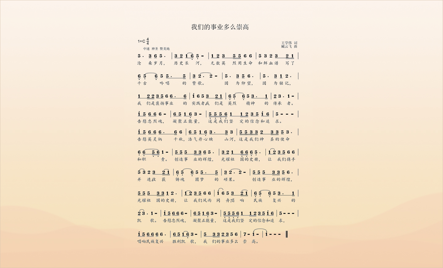 會歌旨在以永不消逝的旋律歌頌和銘記英烈事跡,傳承和弘揚英烈精神。從歌詞到樂譜體現中華英烈不怕犧牲、不為艱險的英雄氣概,深情謳歌中華英烈用赤膽忠心鑄就勝利榮光、捍衛祖國尊嚴的偉大壯舉。歌詞簡約大氣,力求抒發中華英烈褒揚事業的神圣和崇高。樂曲旋律深情飽滿、昂揚豪邁,力求每一個音符都撞擊聽眾靈魂,切身感受中華英烈感動天地、氣壯山河的高貴品格,呼喚和感召世人傳承英烈志、凝聚民族魂、共圓中國夢。